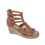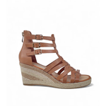 The Pennies Heel in tan by Django & Juliette blends natural leather craftsmanship with elegant strappy detailing and subtle gold buckles. Elevated by a comfortable wedge heel, this design delivers refined style without compromising on comfort, making it an ideal choice for sophisticated all-day wear.